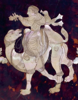 这些老乐器作为一种“特殊文献”,其本身保留的材质、形制、制作工艺等信息对当代传统器乐曲表演及研究无疑具有重要的参考价值 13 。若以“内亚性”视角看陕北所处的地理位置,陕北琵琶作为融汇古典丝绸之路、游牧农耕之间相互往来的文化之果,其隐含的文化成分,仍需仔细梳理。 14日本正仓院被学界视为丝绸之路的终点,其馆藏唐代五弦琵琶的捍拨上的胡人弹琵琶图引起笔者的关注。画中胡人怀抱四弦琵琶骑在行进中的骆驼背上,上身整体转向右侧,左手横向持琴颈向前,琵琶的曲项清晰可见,后方右手持拨子高举过肩,似欲弹拨状。从乐器与演奏者的身体关系看,在这样的情况下,琵琶必须要固定演奏者胸前,否则这样的姿态根本无法实现。笔者不禁要问,那是用什么固定?如何固定的呢?图像呈现的演奏者背部,琵琶仅能看到头部。然而细观其背后不难发现,有一根丝带环于其左腋下右肩上,在背后打单耳结,末端飘拂在空中 15 (见图5)。