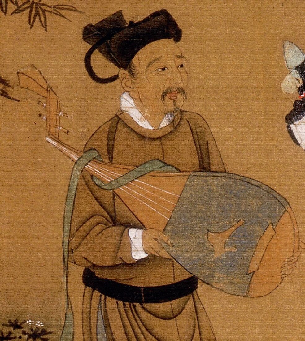 这根带子会不会像陕北琵琶一样用来固定其胸前琵琶?如果是,那这个琵琶的背部,是不是也会有两个像陕北琵琶上一样的“背扣”?如果这个推断成立,演奏者与琵琶之间的“中介物”为琵琶背板上的两个“背扣”和一条丝带,那么上述《宪宗行乐图卷》等图像中琵琶无法实现演奏的问题便迎刃而解。