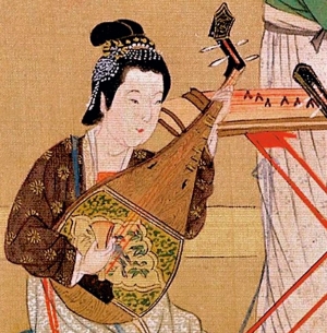 古代四弦曲项琵琶曾有一种椿楸制式。椿楸制琵琶,以背板上着绳系“椿楸”或兼“担环”,系肩带“担绦儿”背于胸前演奏为特征,它是与普通四弦曲项琵琶共同存在的一种制式。目前发现存世椿楸制琵琶的唯一实物藏于日本佐贺县博物馆。其分布从西北到中原,再及朝鲜、日本,也隐约展现出琵琶丝路传统的历史轮廓。