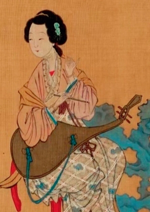 《清人仿仇英百美图卷(局部)》(亦称《千秋绝艳图》)中清晰地绘制出琵琶的背带和背扣。该图卷绘有历代著名女子数十人。其中,南宋罗惜惜坐于假山石旁,一把琵琶背部向前横抱在腿上。“琵琶背部有两个结,结上系一条蓝色绦带,可能为携带背挎之用,这种装置,在琵琶实物中尚未见过。” 32 据中国国家博物馆官网资料显示,该图原为明代人绘制。现可明确,蓝色“绦带”为担绦儿,背部的两个“结”,即为椿楸(见图18)。 33 此图绘制的南宋琵琶椿楸上未见担环。同是明代画作,大英博物馆藏唐寅绘《陶谷赠词图》(见图19)。 34 图中女性琵琶演奏者,上身前倾,下巴微启,似与对面人交谈。其抱的四弦曲项琵琶,着蓝色担绦儿挂于右肩,系于琵琶背板底部的椿楸之上,绳结清晰可见。担绦儿与椿楸之间亦未见担环。