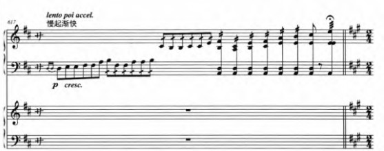 最后,也有三个部分体现出木兰英姿飒爽上阵杀敌的英雄气概。第一处在乐曲的第二部分“展开部”,在这一部分,乐曲结构主要分为“入侵”“出征”和“拼杀”三个乐段。其中,前两个乐段主要运用了左手的“(快速)换把”“滑音”技法以及右手的“快速弹挑”“连续扫佛”“摇指”“扫、轮、扫、弹、扫、弹、扫”等多种组合技法。模仿出面对敌军入侵,千军万马出征的声音,仿佛花木兰御马驰骋沙场的样子也跃然眼前,塑造出一个英勇上阵杀敌的巾帼英雄形象;第二处出现在乐曲“呈示部”的“副部”乐段,此处乐曲以活泼的小快板形式展开,由琵琶与钢琴的“一呼一应”发展进行,描绘出木兰练武时英姿飒爽的精神面貌,其中右手大段的“十六分音符”快速弹挑也为乐曲的向前发展起到推波助澜的作用;第三处出现在乐曲“展开部”的“拼杀”乐段,在这一部分强烈的“扫拂”技法拉开了战争的帷幕,左手“滑音”与右手“扫拂”技法,与前面的“摇指”形成鲜明对比,也将整个乐曲的氛围推向了最高潮。在这一段,乐曲整体的力度和气势上都变得更强劲,展现花木兰在战场上彻底忘却生死,只剩驱逐敌人、保家卫国的情态。