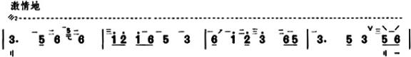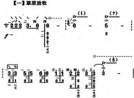 引子这一部分以自由的节奏进入,主要运用了右手的长轮配合左手的装饰音来演奏,属于蒙古族长调风格的旋律,使琵琶曲的演奏带有蒙古马头琴的韵味,生动地展现了蒙古大草原一望无际的辽阔景象,同时慢慢引出该乐曲的主题。