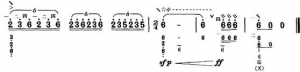 在第四段千万朵红花遍地开中,段落的开头用“前八后十六”的节奏型进入,力度由弱渐强,生动形象地模仿马蹄的声音由远及近,旋律活泼跳跃,注意大指的音压实,泛音准确。“马蹄声”结束后,带有摭分技巧的这一乐句的音乐具有很浓郁的蒙古族风格,模仿了蒙古乐器低音四胡的演奏风格,音色要弹出如同一个蒙古壮汉形象般厚实。