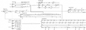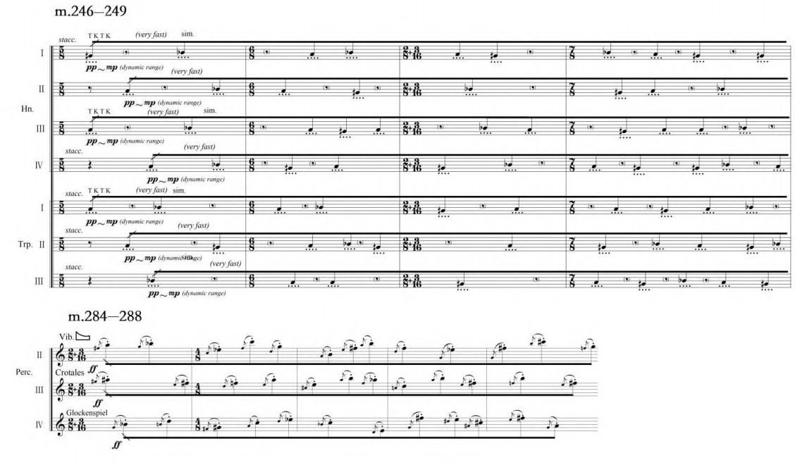 其四,以上三者的综合式音色—音响织体间,形成累积、层叠、浸染和消散等形态,象征着天地间风云变幻莫测。