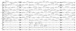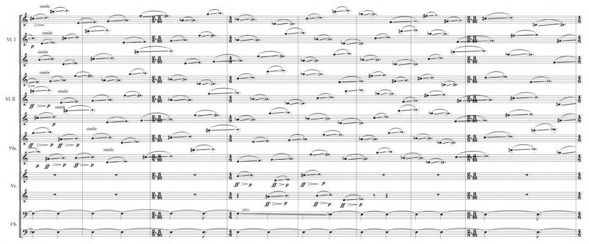 基于此,我们也就相对容易理解秦文琛创作的《彼岸的回声》《对话山水》《云川》等大型管弦乐作品中,为何会蕴藏着巨大的音响能量。在《云川》中,存在着大量点状织体构建的音色—音响,它们时而作为主题音响的重要组成部分;时而以连续、密集的点状音响形成线状织体,生发出新的意向;时而又会以极具空间感或稀疏或密集的多声部“散点”状态,构成变化多端的面状织体,以此来象征作曲家对于“云”的共感和天马行空的想象力。