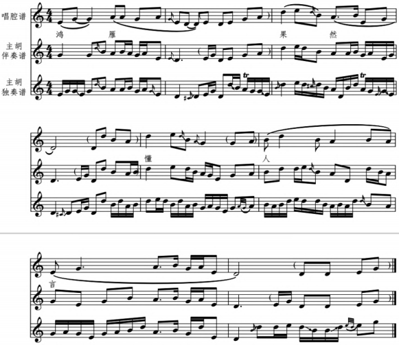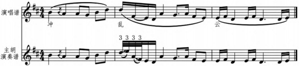 1.相同乐段、乐句或乐音重复演奏时,会根据剧情发展、唱腔与唱词逻辑进行演奏手法处理的变化,通过改变力度、弓法、左手润饰、翻高或翻低八度等手法对旋律进行变化发展。