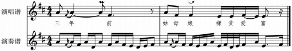 “同中求变”表演观念的运用,要求演奏者拥有可供使用的大量演奏技法和音乐语汇,具备丰富的演奏经验以及强大的即兴发挥、审美意识等能力,同时要合乎唱腔和唱词的逻辑,符合曲情表达的需要,从而达到“死谱活奏”的效果。毕竟,“在音乐表演中,若‘不通文理’,只会以所谓‘忠实’的态度严格照谱唱奏,‘相传守而不变’,是无法达到‘必一唱而形神毕出’这样的音乐表演美学至高境界的。”[18]