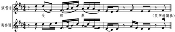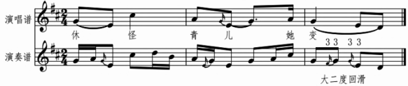 所谓小三度、大二度和小二度回滑,是指滑音上行阶段可以采用不同的起始音,分别拉出小三度、大二度、小二度的效果。音程关系上的细微差别,能够使回滑音在质地、色彩、韵味上产生差异,形成千变万化的腔韵效果,令人百听不厌。在实践运用中,需根据唱词语义,结合音乐发展的逻辑,有选择性地使用。