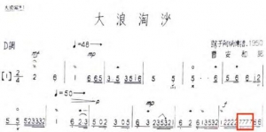 为了找到这两个音高的差异,笔者对比了阿炳1950年和林石诚1994年《中国民族音乐名家名曲经典系列》的录音版本。曹安和记录阿炳演奏谱的《大浪淘沙》⑯(见图7),乐谱第二行最后一小节第二拍的音高si,阿炳的录音听到的是明显降低而感觉“不准”的si,林石城演奏得就“舒服多了”。理论、实物与音响在这一刻得到互相印证。这正是乐器学研究“文物互证法”⑰的典型案例。