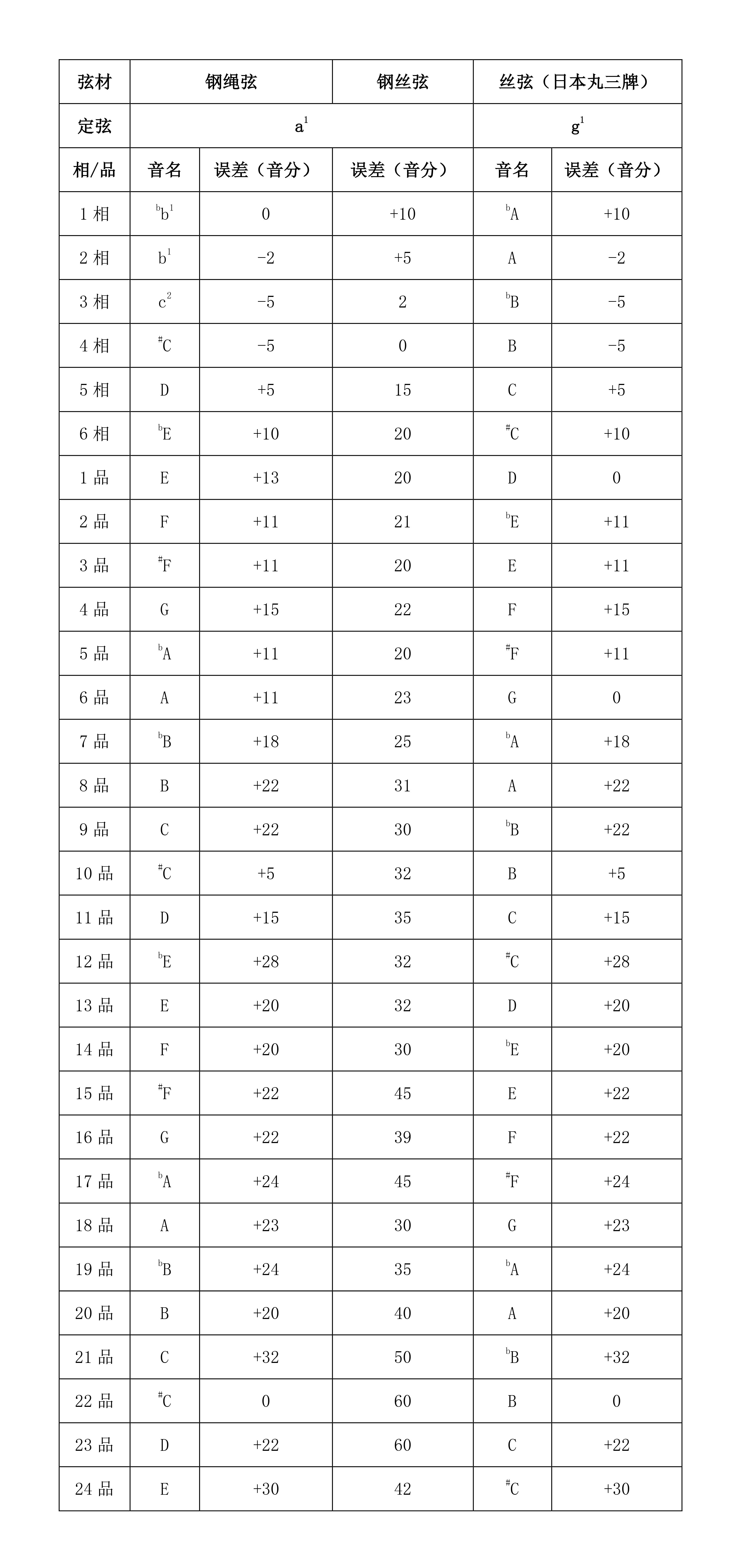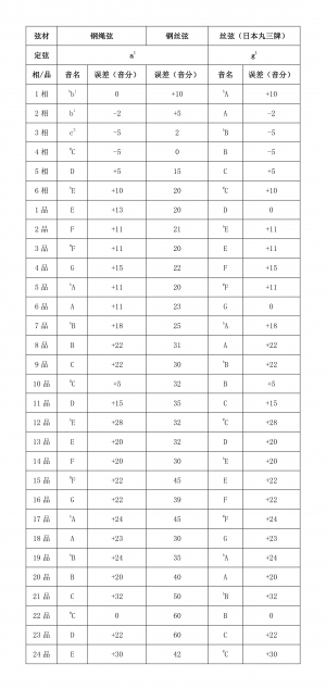 以上两件音品位置未经改动的琵琶,保留了20世纪中叶以前琵琶的音高信息。为此我们选取了日本制丸三品牌丝弦用于两件琵琶的测音。测音在琴弦调试一周进行⑪。测音数据如下(见表1)。