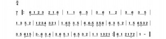 笔者弹奏的实际旋律仅在一个八度之内,实际演奏旋律为(谱例2):