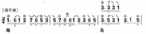 ”。例如《贵妃醉酒》中“海岛冰轮初转腾”一句的“海”字,为去声字,“海”字所对应唱腔的前半部分为向下的旋律走向。所以“海”字第二拍上的笔者实际弹奏旋律音高为“