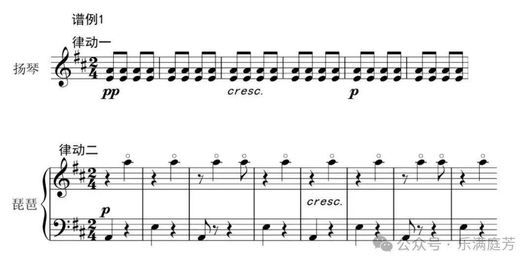 全曲有两个节奏律动贯穿始终,它们在打击乐段落一(A)中即已呈示。乐曲伊始,扬琴的双音重复制造出来的八分音符均衡律动是为律动一,琵琶在四分音符的均分节奏中以切分节奏打破平衡,构成律动二(见谱例1)。这两个节奏律动如同串连全曲的“红绸带”[5],时而隆重登场亮相,时而伴随着旋律段落,退为其背景层次。