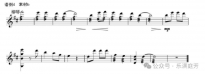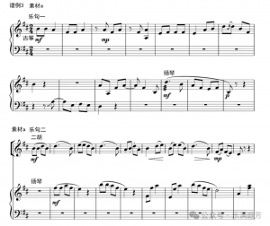 素材a(见谱例3)在第一旋律段出现了两次。首次亮相时在律动二的映衬下,完整地将两个乐句都予以呈示。乐句一在古筝声部摇曳而出,尾音长音延留时由扬琴嵌档填空,将声部顺接了过来,乐句二转至二胡声部,扬琴紧而随之,在二胡声部上方作五度模仿,形成对位式的线条连接。不过,乐句二现身一次之后很快便遁入律动二的切分锣鼓节奏中隐匿而去,此后的素材a事实上是乐句一的诸种变化。此段中,乐句一以“合头换尾”的方式重复出现了一次。作曲家以“加垛”手法扩充了乐句,同时通过节奏重音的改变,在听觉上变原先的2/4拍为3/8拍的律动,为了加强这一律动,在原本的柳琴、筝之上再齐奏叠加了二胡、琵琶声部,与扬琴击奏出的律动一形成节拍错位。乐句中新增的变宫音虽只是短暂经过,却使得调式有了一种瞬间即逝的游移色彩,也为其后音乐中变宫音的出现作了色彩铺垫。