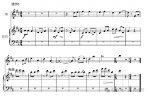 两个主题素材采用中国民间音乐某些常见的旋律发展手法,但不似中国传统器乐作品中主题旋律从头至尾一次性的全方位展示,或由某件乐器主奏,或齐奏式的单调织体布局,而是将旋律线条穿插、分散在不同乐器、声部中,呈现出多彩、多重的音色交织与对比。同时,融入西方作曲技法中的复调技术构筑多层次的立体空间,对比、模仿等复调手法巧妙地穿插在这些不同的音色流转中,织就了丰满复杂而又生动的立体层次。