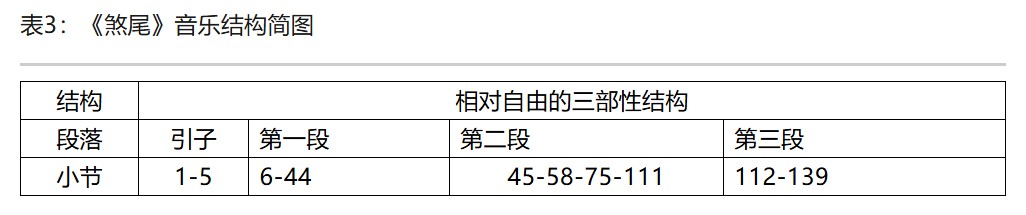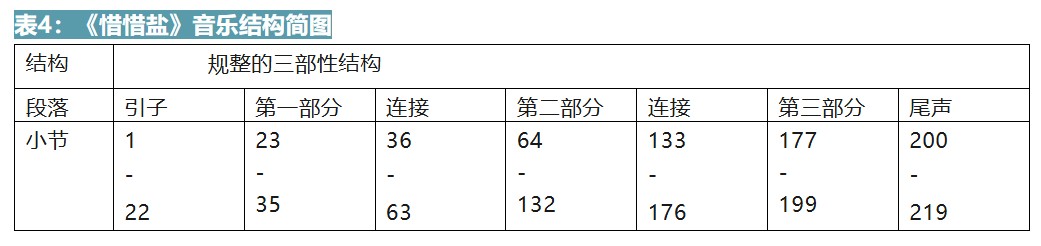谱例3:《煞尾》之“三煞”如果说《煞尾》的结构是一波未平一波又起,《惜惜盐》就是有始有终、首尾呼应。这部作品整体是相对规整的带有引子以及尾声的三部式结构。(表4)每个部分之间都有明显的连接过渡段,整体感觉十分紧凑。