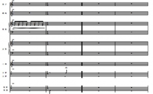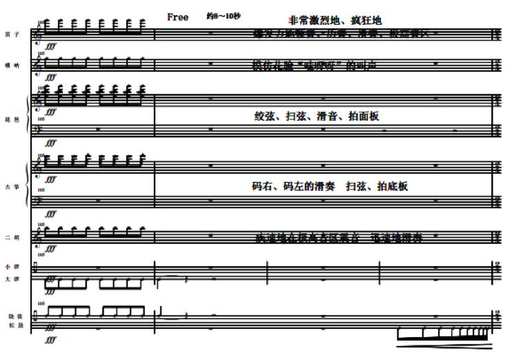 此后第二段转而以变幻莫测的音色尝试为特点。整个段落以管弦乐器为主线,模拟戏曲声腔,其他乐器则模拟戏曲文武场伴奏,形成了自由的唱腔配合多样化的伴奏模式,戏曲音乐风格十分明显。段落开始以笛子、二胡的线性单音与琵琶、古筝点状轮奏交叉引入,进而旋律线以连续的不同声部六连音形式出现,形成快节奏的层次感。伴随琵琶模仿京剧锣鼓经滚头子,插入其他乐器的滑音,形成诙谐、幽默的音效。随后在京剧锣鼓经【急急风】中推向一个演奏高潮,结尾部分用到锣鼓经【回头】。在以一段即兴自由表演完成收束。此段中,于各个乐器之陈述之间已浮现出隐伏的主旋律,被打散的旋律于不同的音色效果交替浮现,在爆炸性的收尾中终止,形成另外一种“煞尾”方式。(谱例2)