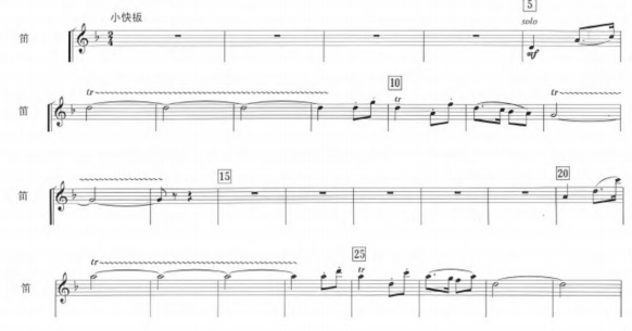 谱例1:《风雪爬犁》“竹笛”1-28小节