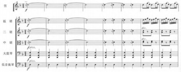 这部作品的创作融合了西方作曲技法和中国传统音乐元素,通过独特的旋律线条和丰富的和声织体,展现出了浓厚的东北地域风情。在旋律的构思上,作曲家巧妙地运用了东北民间音乐的元素,如颤音等装饰音的运用,使得旋律更加生动,富有表现力。乐曲伊始,便由扬琴、琵琶、中阮、板胡、二胡、中胡等乐器演奏营造氛围,描绘出骏马从雪地奔腾而来的场景画面。(见谱例4)在上述乐器“pp”力度的伴奏下,独奏的竹笛以其特有的悠扬和清脆,演绎出欢快、热情的主题旋律,仿佛在讲述猎人在面对丰硕的成果时的喜悦心情。(见谱例1)