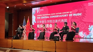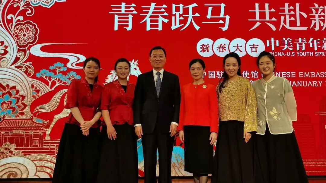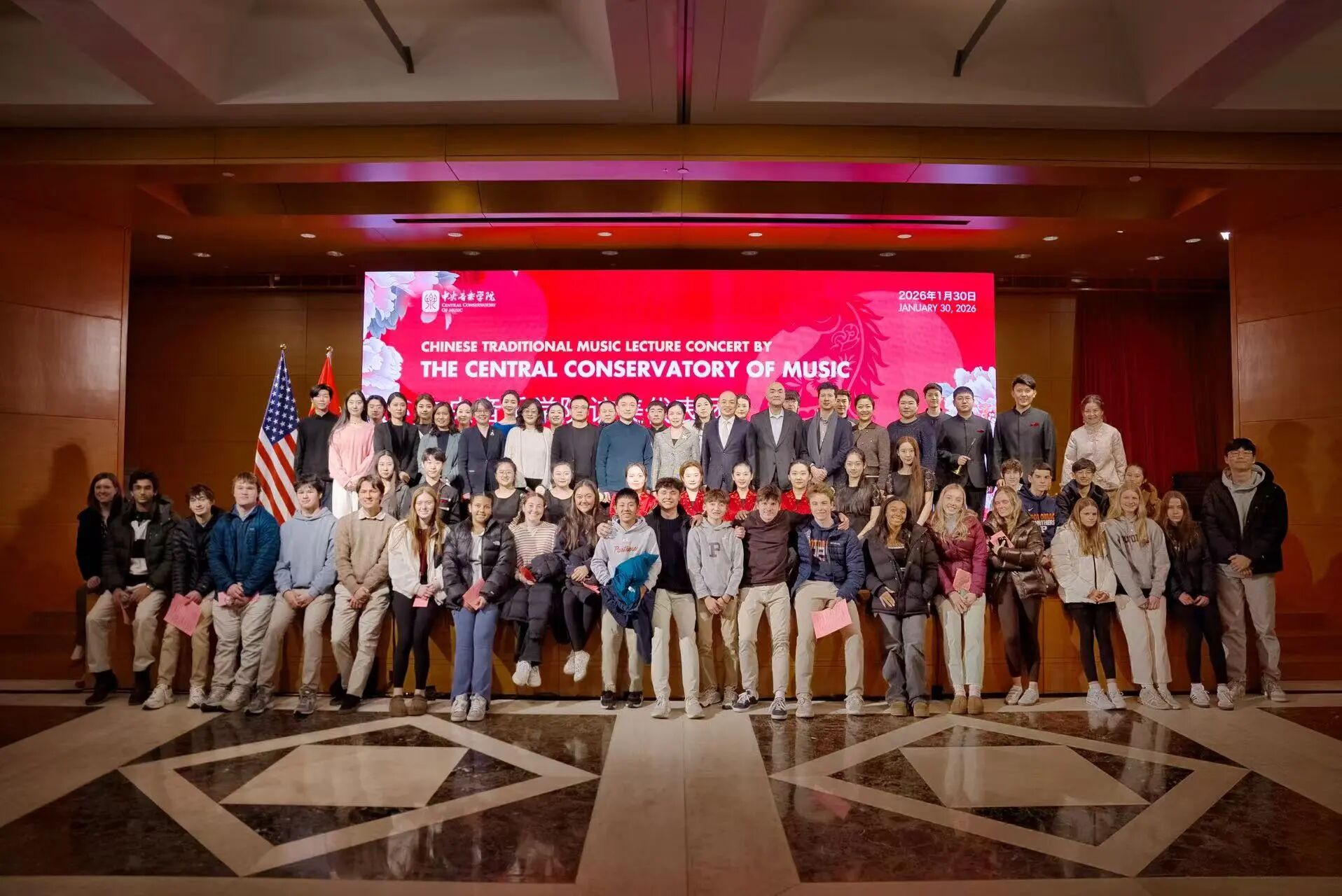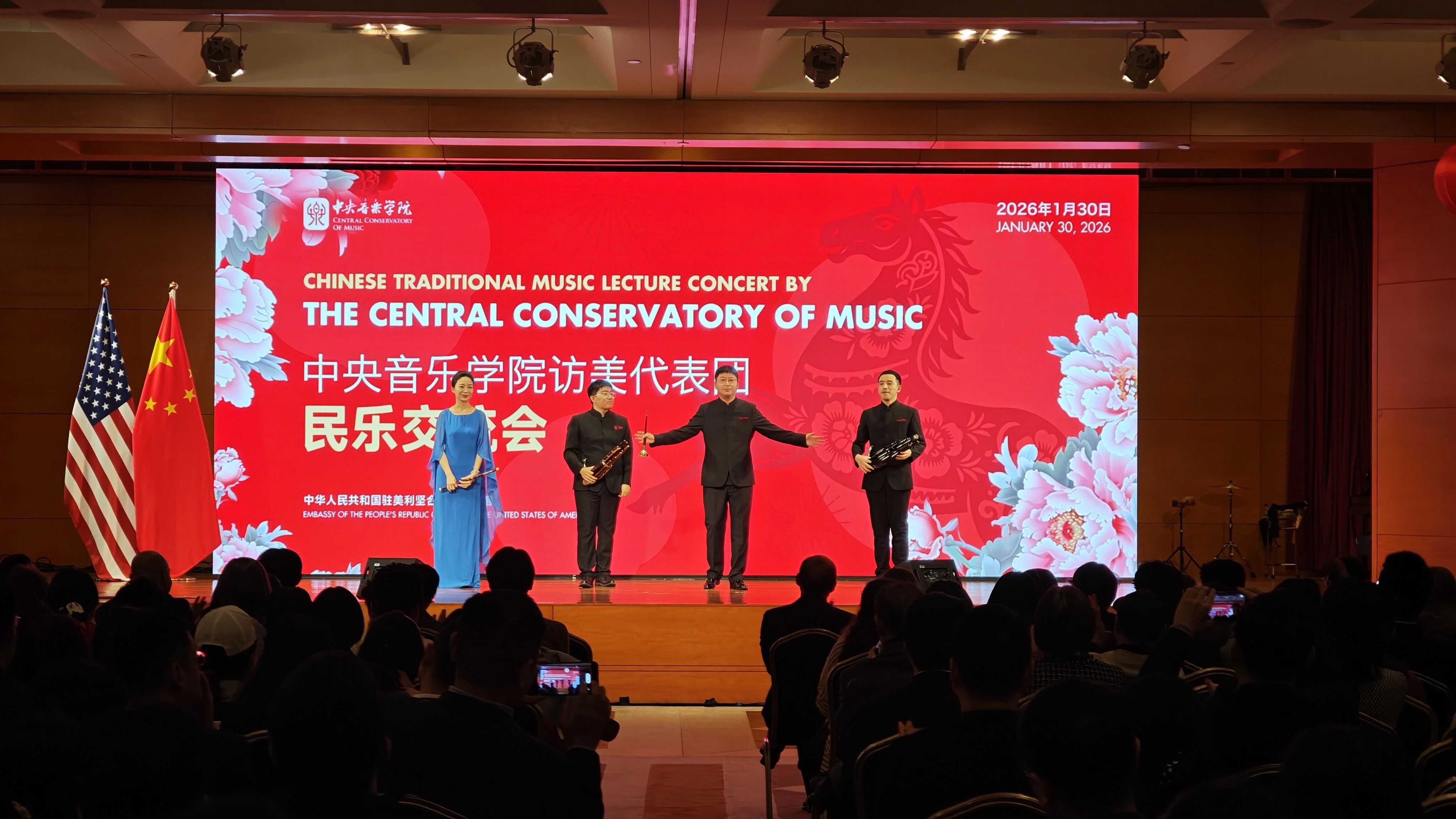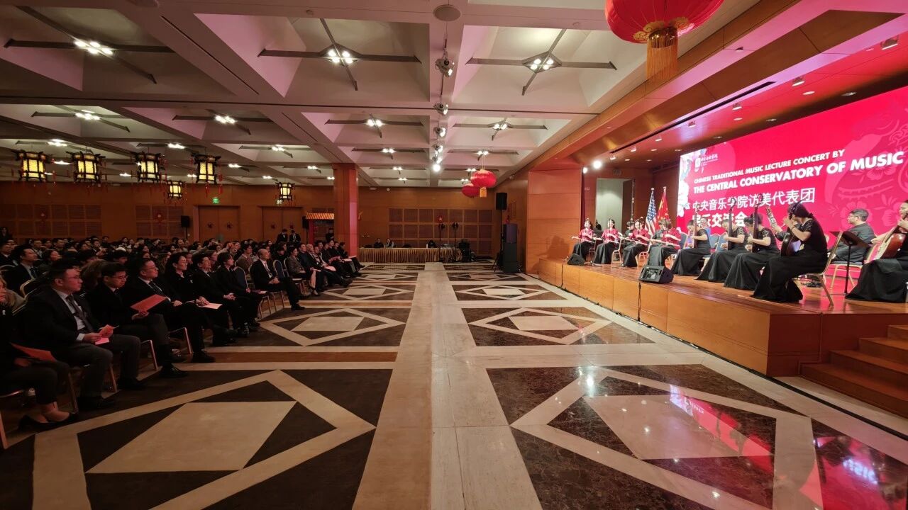 1月30日下午,代表团自费城抵达华盛顿特区,在中国驻美国大使馆献上一场意蕴悠长的交流音乐会。音乐会荟萃京剧锣鼓《大闹天宫》、竹笛与笙《喜相逢》、琵琶齐奏《天山之春》、琵琶与阮《彝族舞曲》、唢呐独奏《百鸟朝凤》、二胡齐奏《良宵》《赛马》、民乐合奏《花好月圆》等经典民乐佳作。在美当地华人华侨及200余名美国中学生齐聚现场,在热烈的氛围中,共赏中国音乐的独特魅力。中国驻美大使谢锋出席交流会并在开场前发表热情洋溢的致辞,对中央音乐学院此次赴美访演予以充分肯定与高度评价。