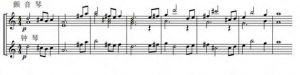 除主题之外,非旋律化的音型材料也发挥了十分重要的作用。如在“光明主题”的呈示后,在木盒均匀节奏的敲击声中,前八后十六节奏的固定音型由高胡声部开始,之后二胡、柳琴、中胡、琵琶、大提琴等声部渐次进入,最后由所有拉弦乐器和弹拨乐器构成密集的音响体。达到高潮后,音型化材料变成同音持续反复的形态,而主要主题就在这种具有较强动力性的背景衬托中以昂扬的姿态奏出,形象格外鲜明。在作为该乐章再现曲式中间对比部分的两个段落中,除了局部的音调片段之外,各种非旋律化的音型材料得到了淋漓尽致的发挥,生动地表现了世间的众生百相与纷杂喧嚣。