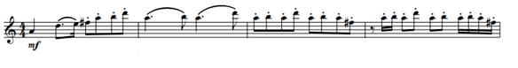 第一乐章采用再现四部曲式结构,首尾是主要主题的呈现,中间以两种不同性质的材料与之形成对比。主要主题首先在第44小节处由笛声部奏出(见谱例2)。