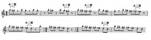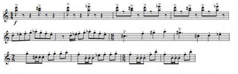 该主题的前2小节具有鲜明的无调性特征:第1小节为两个上行的大七度,两个大七度之间则是三全音关系;第2小节则是三个三全音音程的连接。后四小节为以两小节为单位的重复结构,虽然出现了连续的级进进行,但调性依然模糊,每个小节都以三全音音程结束,保持了与前2小节的联系。虽然从谱面上看前四小节都为4/4拍,但第3-4小节通过重音的调整而改变了4/4拍的节拍规律,8个八分音符按照3+3+2(1+1)的方式加以组合,实际上已经具有了以八分音符为单位拍的特征,到第5-6小节则直接变成5/8拍。现代音乐中打破传统节拍节奏周期循环规律甚至频繁变换节拍的手法并不鲜见,但能够在转换时还有意保持渐进式的联系,确实别出心裁。