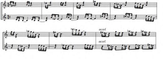 该插部也是由一些长短不一的碎片化音组构成,各音组音符数量的安排按照斐波拉契数列的前五个数(即1、2、3、5、8)循环往复,每个音组之间都以长短不等的休止隔开。各声部都按照这样的数列独立运动,但声部间形成了看似偶然实则严密控制的节奏对位。从音高材料来看,这些音组的核心材料基本上都是小二度与三全音。在这些音组横向进行的同时,其他声部还有一些纵向音块化的和声铺垫,使音响具有较高的紧张度。这样的材料及音响与第二乐章的第一主题有着十分密切的内在联系,似乎是在提醒人们不要忘记痛苦、时刻警惕恶魔卷土重来。