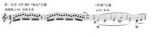如在第一乐章中,乐队全奏的引子“命运”主题与之后合唱慢板主题的对峙,就极具戏剧性和悲剧性的音响张力。该引子主题与贝多芬的“命运”主题异曲同工,就“命运”撞击的基础音型而言,贝氏仅为4次,而赵氏则为l2次(见谱例2),显然更加强烈而急迫,且因基于清乐D羽调式而带有传统戏曲的悲壮之气;进而在变化重复时,赵先生还采用“展衍法”将该撞击声拓展到l7次;尤其是之后大提琴和低音提琴齐奏该类动机音型的展衍,更具有中国传统音乐旋律发展的意趣,同时也令人联想到马勒第二交响曲《复活》开篇近似的陈述方式。而慢板主题在悲愤激昂且戛然而止的“命运”主题之后,情绪急转直下,突然变得悲叹而忧伤。该主题先由女声以“哦”的轻声演唱,后由男声接续,最后由男女声合唱达到该段音乐的高潮;而与此同时由乐队齐奏或支声加持,二者共同塑造出吟诵式的苦难之声。由“命运”主题与“苦难”主题的强烈对峙所导致的巨大张力,为最后走向辉煌的第五乐章埋下伏笔。这也令人回忆起吉雅·坎切利的那部“复风格”《第五交响曲》,其一开始羽管键琴与乐队在音响、力度上的强烈反差——“是我童年的记忆与后来艰辛生活的对比”(吉雅·坎切利)。二者极具张力的音乐表达,有异曲同工之妙。