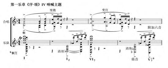而该乐章的“呐喊”主题则集中表现为合唱与乐队的抗衡性交替,且和声思维较为复杂(见谱例3)。其乐队的低音线条“bB—bA—G—bG—F”,从西方视角看它是一个“弗里几亚”进行,常见于传统和声小调;然而在此则为bB宫系统,所以乐队的低音“bA”更像秦腔的“苦音”清羽,于是从整体上构成了“I—I2—VI7—V7+6”的调式和声进行;同时合唱中包含着“E”变徵和“A”变宫,而乐队则含有“bA”清羽和“bE”清角,低音“bG”则近似于一个倚音。由此可见,合唱使用雅乐音阶,乐队使用燕乐音阶,二者便形成同宫不同调式的对位,且以竞奏关系呈现出协奏曲的素质。
