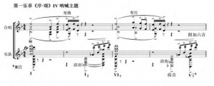 为了追求古色古香之意蕴,作曲家重点引用了琴曲《梅花三弄》的泛音主题,作为贯穿整部交响套曲的核心音调。关于《梅花三弄》,《蕉庵琴谱》如是题解:“从容和顺,为天地之正音;而仙风和畅,万卉敷荣,隐隐现于指下。但新声奇变,稍近时俗,然恬静幽清亦古曲也。”其中的泛音表现是“以梅为花之最清,琴为声之最清,以最清之声写最清之物,宜其有凌霜音韵也。”(杨抡《伯牙心法》)可见琴曲《梅花三弄》寓意着古代文人对高洁情操的精神追求,反映出“儒道”合一的文化意蕴。作曲家正是借助这一耳熟能详的音乐,使这一核心主题犹如星星之火那般,通过衍化发展,燎原于整部交响乐中。