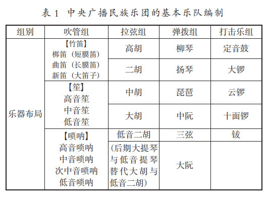 在以彭修文为主导的乐器改良小组进行了一系列的乐器改革后,当时中央广播民族乐团的基本乐队编制形成了与西洋管弦乐编制相呼应的局面。与西洋乐团相似,乐队同样包括拉弦组(提琴)、吹管组(木管、铜管)和打击乐组,但除此之外,还具有独具中国特色的弹拨乐组。笔者将其乐队编制进行总结,如下表1所示,由高至低进行排列。