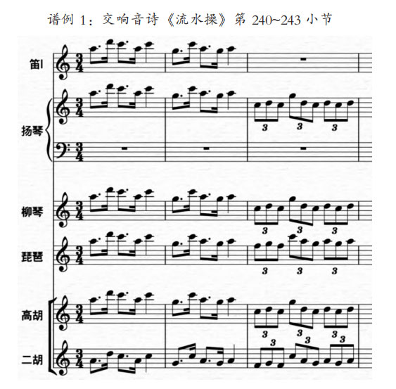 除此之外,音响平衡还需遵循音区对等的原则。因此,以“局部”为主体的重复情况较为常见。在谱例1的最后两个小节中,琵琶、高胡以及二胡形成了一个主要旋律线条,又加了柳琴与扬琴的音色作局部重复。在原本的民族管弦乐中,扬琴往往更多的是演奏开放性的和弦,但是在此并未安排扬琴声部作和声性音高布局,而是以主旋律线条为主体布局。这样做的主要原因是,他希望在保持音响平衡的同时,实现“化合音色”的目的。因此,扬琴在这里并未起到“助粘剂”的作用。