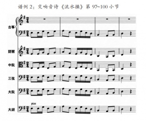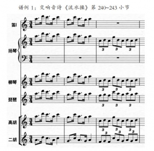 就“化合音色”而言,在彭修文的音乐中,其音色的选择显得十分重要。配器者需要根据音乐风格、音色以及音域等多方面斟酌后,才能找到相对适合的乐器组合方式。与此同时,这种组合形式有时并不尽相同,而是随着民族管弦乐作品中情绪风格的波动进行相应的调整与改动。