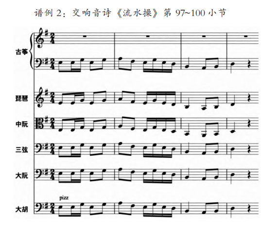如在谱例2中,以古筝、琵琶、中阮、三弦、大阮以及大胡拨奏的音色,“化合”出新音色。彭修文在此曾指出,在原本没有加入大胡拨奏的音色之时,弹拨组也可“化合”出古琴音色,但常规的弹拨乐器组合音色较为明亮,尽管加入了三弦和大阮这样的低音组弹拨乐器,仍然还不能体现出古琴的醇厚音色。因此,他改变了拉弦组中大胡的演奏方式,将大胡的拨奏加入主题中,瞬间就加深了主题的浓厚音色,从而“化合”出了更加类似古琴的音色。