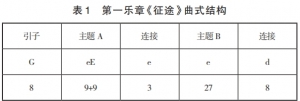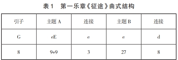 乐曲的第一乐章标题为《征途》,生动描绘了红军踏上漫长长征征途的壮阔历程。该乐章曲式结构规整,历经多次转调,节奏变换丰富多样。前奏简洁而悲壮,恰似红军坚定前行的步伐;歌唱性的旋律与激昂的节奏交织,彰显了红军将士在长征路上不屈不挠的意志与勇往直前的气概。此乐章整体可分为五个部分,其曲式结构见表1。