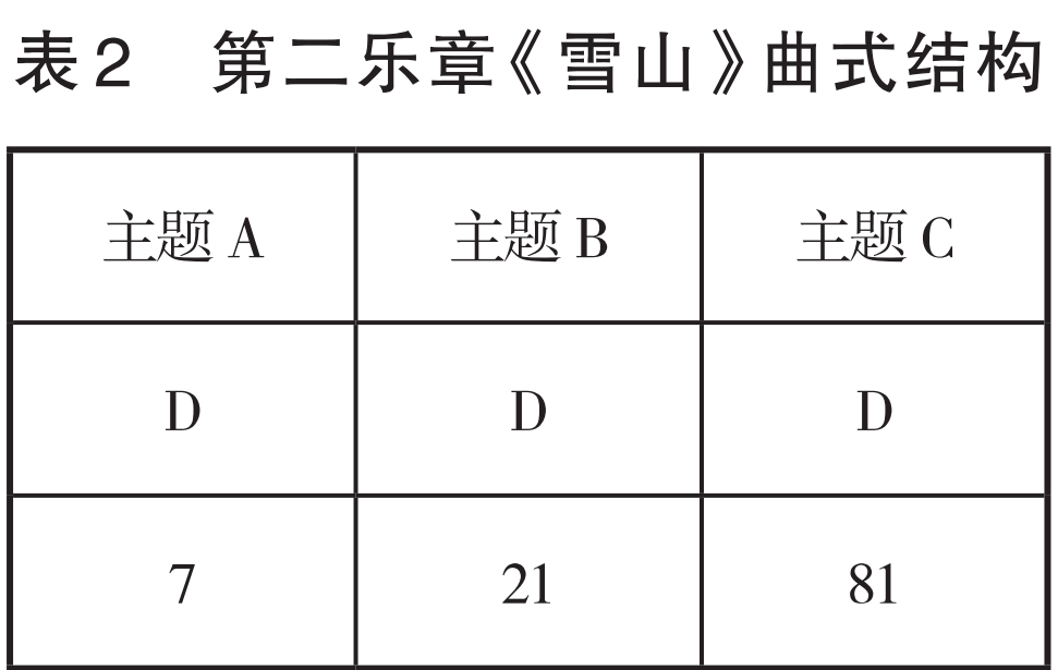 乐曲的第二乐章标题为《雪山》(第65—173小节),共108小节。在长征的艰难历程中,翻越雪山无疑是最为困苦、最具挑战性的,其艰难程度尤为突出。红军在长达两万五千里的长征途中,翻越雪山的路程几乎占据了全程的一半。面对巍峨耸立、白雪皑皑的雪域高山,红军战士展现出了无畏的勇气与坚定的决心,从未有过丝毫退缩。第二乐章的曲式结构见表2。