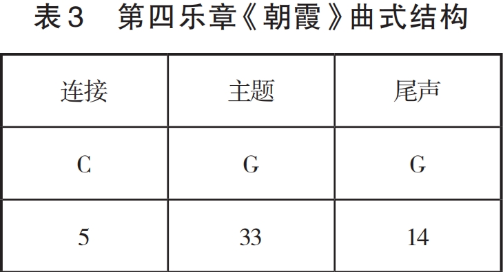 乐曲的第四乐章标题为《朝霞》(第194—245小节),共52小节。此乐章深刻描绘了红军队伍历经艰辛终于抵达陕北的喜悦之情,同时也寓意着中国革命即将迎来曙光与希望。该乐章的曲式结构规整,由三个段落组成,主题部分以G大调呈现,曲式结构见表3。