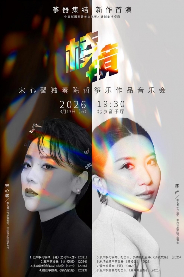 以八部作品构建一座声音的棱镜,折射出作曲家陈哲与演奏家宋心馨对筝乐艺术深度与广度的探索。 音乐会以乐器革新为声景,构建多元音色宇宙。从五声筝的传统根脉,到钢丝筝的典雅余韵;从七声筝的现代哲思,到多声筝的立体层次,再到多功能低音筝的深沉空间——每一件革新筝器都成为独特的叙事媒介,如棱镜般折射出筝乐艺术的万千可能。