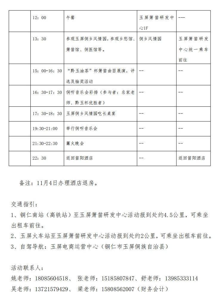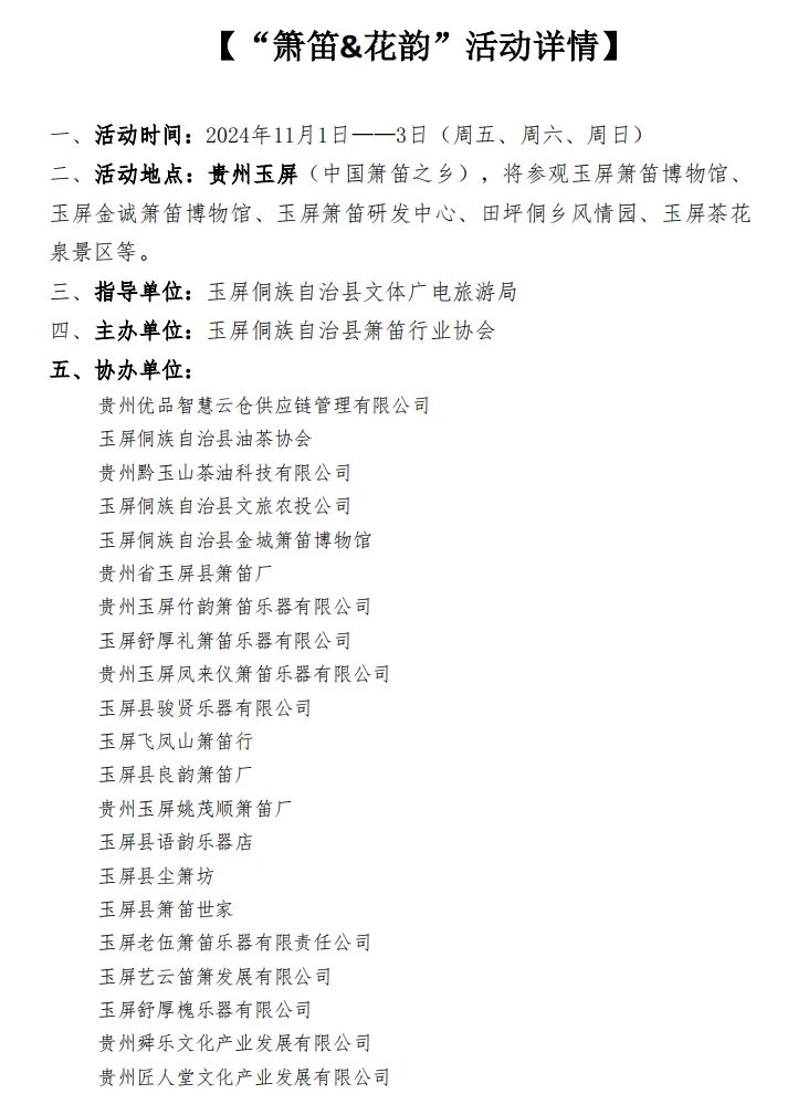 二、活动地点:贵州玉屏(中国箫笛之乡),将参观玉屏箫笛博物馆、玉屏金诚箫笛博物馆、玉屏箫笛研发中心、田坪侗乡风情园、玉屏茶花泉景区等。