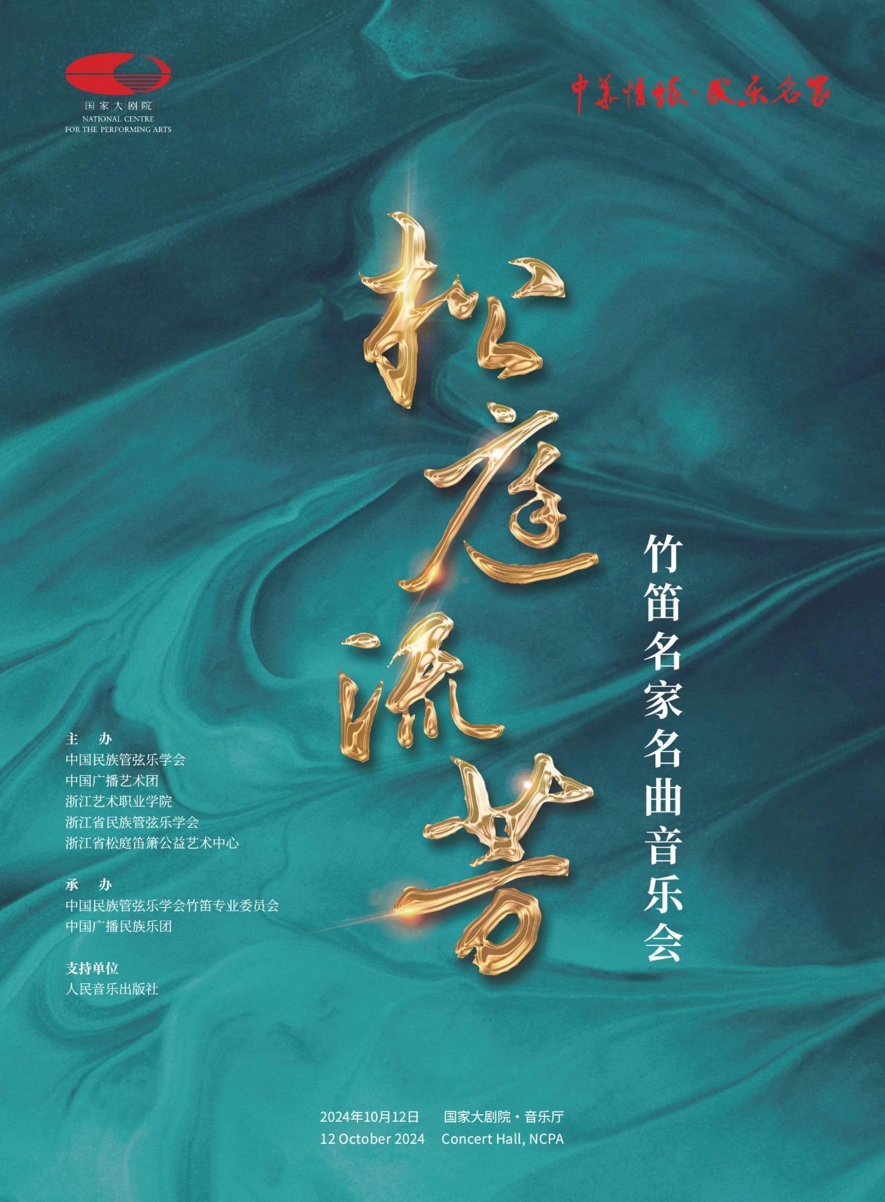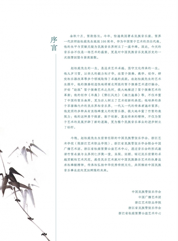 金秋十月,笛韵悠长。10月12日晚,由中国民族管弦乐学会、中国广播艺术团、浙江艺术职业学院、浙江省民族管弦乐学会、浙江省松庭笛箫公益艺术中心联合主办,中国民族管弦乐学会竹笛专业委员会和中国广播民族乐团承办的“松庭流芳”竹笛名家名曲音乐会在国家大剧院音乐厅隆重举行,以此纪念中国笛子艺术泰斗赵松庭先生诞辰100周年,此次音乐会不仅是对赵松庭先生卓越艺术成就的崇高致敬,更是对中华优秀传统文化和中国民族音乐的一次深情回望。