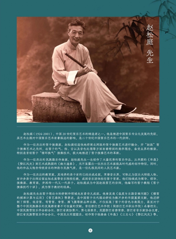 赵松庭先生(1924-2001)作为中国笛子艺术的杰出代表,以其深厚的艺术造诣、卓越的创作才华和广泛的教育影响,被誉为笛坛“一代宗师”。他一生致力于笛子艺术的创新与发展,不仅在演奏技艺上独树一帜,更在笛子曲目创作、理论研究、人才培养、乐器改革等方面做出了巨大贡献,他的这种勇于探索、敢于创新、重在传承的精神,不仅为中国笛乐艺术在当代的发展奠定了坚实的基础,开辟了新的道路,更为整个民族音乐事业的进步树立了标杆。