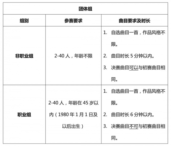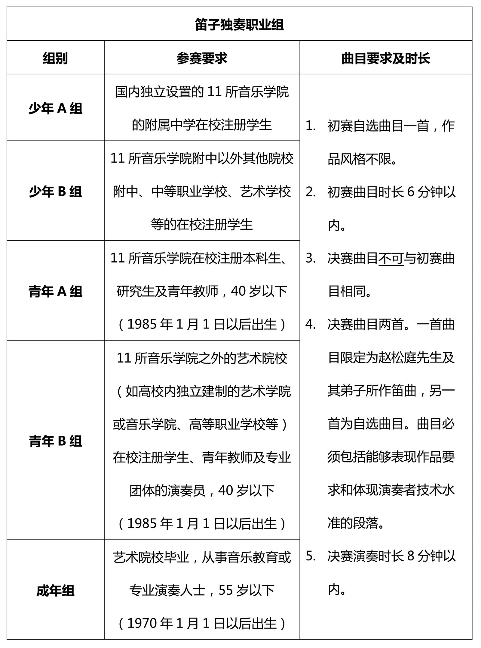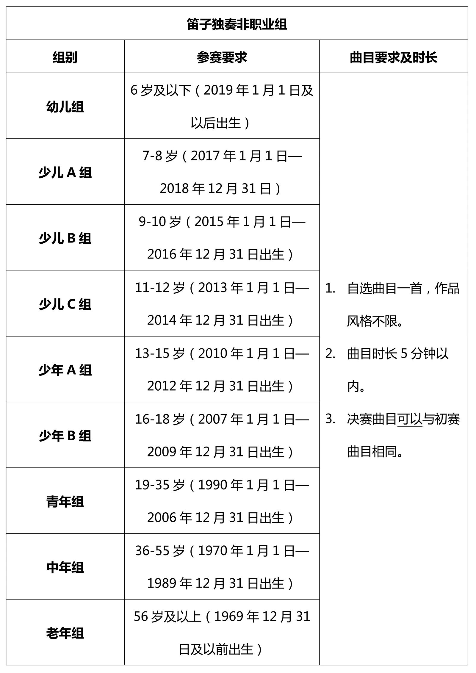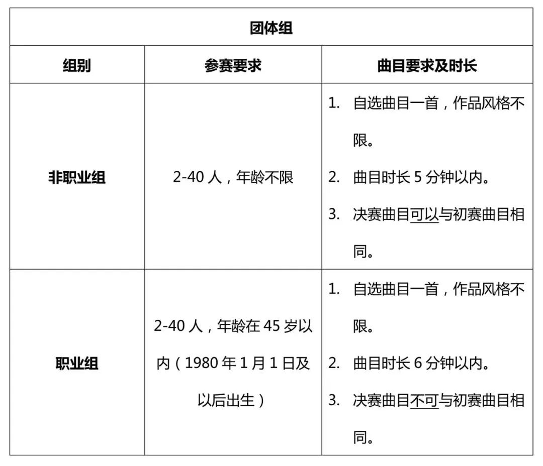 该项目下不设分组,不限年龄,自选曲目一首,作品风格不限。曲目时长6分钟以内。决赛曲目可以与初赛曲目相同。