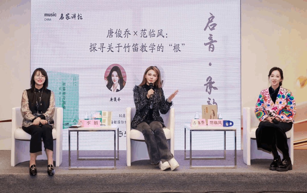 2025年10月24日,在上海国际乐器展 E2-M19 会议室,名家讲坛“启音·承韵:探寻竹笛教学的‘根’”圆满举行。本次活动特邀上海音乐学院教授、著名竹笛演奏家唐俊乔,中央音乐学院教师、青年竹笛演奏家范临风担任对谈嘉宾,上海音乐学院中国竹笛乐团亲临现场进行精彩演出。两位嘉宾以“竹笛教学的根”为主题,深入探讨了竹笛艺术的传承与发展,同时为范临风老师编著的图书《竹笛研习指南·启音》举行了首发预售预热活动,现场气氛热烈,吸引了众多竹笛教育者、学习者及音乐爱好者前来参与。