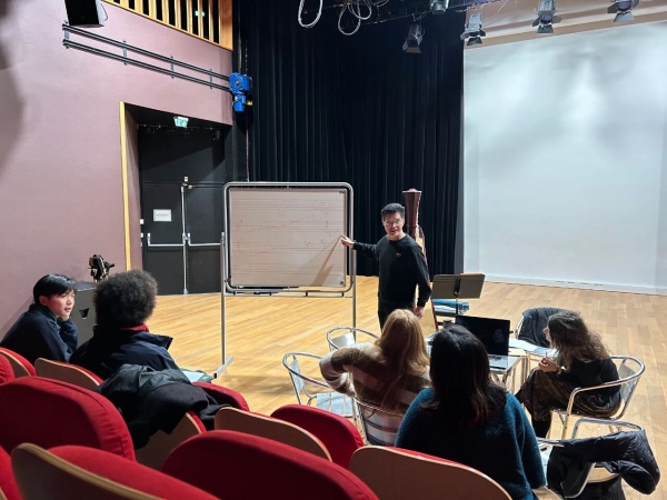 通过讲解笛箫乐器的音程、音区、音域等基本原理。这些内容对他们来说,虽然十分陌生但很期待。大家学习的热情很高,经过长达四个小时的授课,学生们受益匪浅,拼命做笔记,还积极提问。要求一个月之后,他们将笛箫乐器融入到自己的创作作品中,也就是说,接下来一个月之内,他们的作品里要有中国乐器,这对他们来说是全新的创作体验,可喜的是昨天就收到有的学生寄给我她们写完成的作品,采用笛与竖琴的形式呈现。