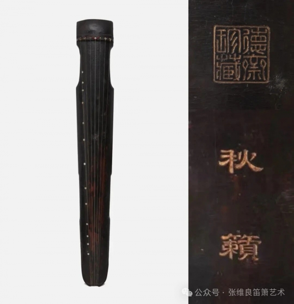 古琴“秋籁”——仲尼式,唐代。深褐色漆,冰裂断纹,琴体浑圆而厚。背面刻琴名“秋籁”及“德斋珍藏”印章。琴腹内朱书“大唐开元三 李晋制”字样。音色典雅,细腻圆润,音量虽小而余韵绵长。此琴原藏明末清初琴家叶诗梦,1985年转由成公亮收藏,现由成红雨收藏。