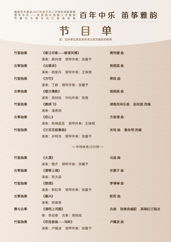 国家艺术基金2025年度资助项目《百年中乐——民族器乐演奏人才培训》项目第二期系列汇报音乐会共4场: