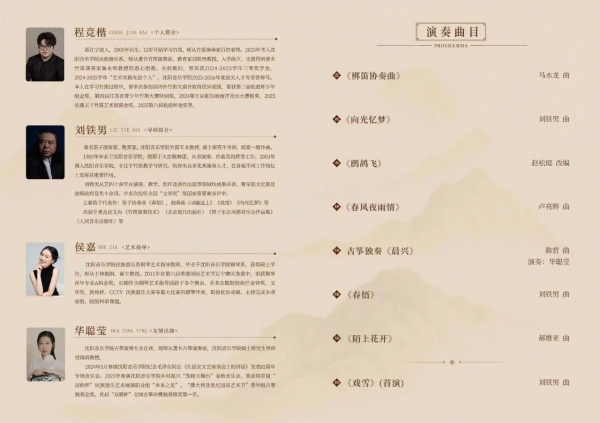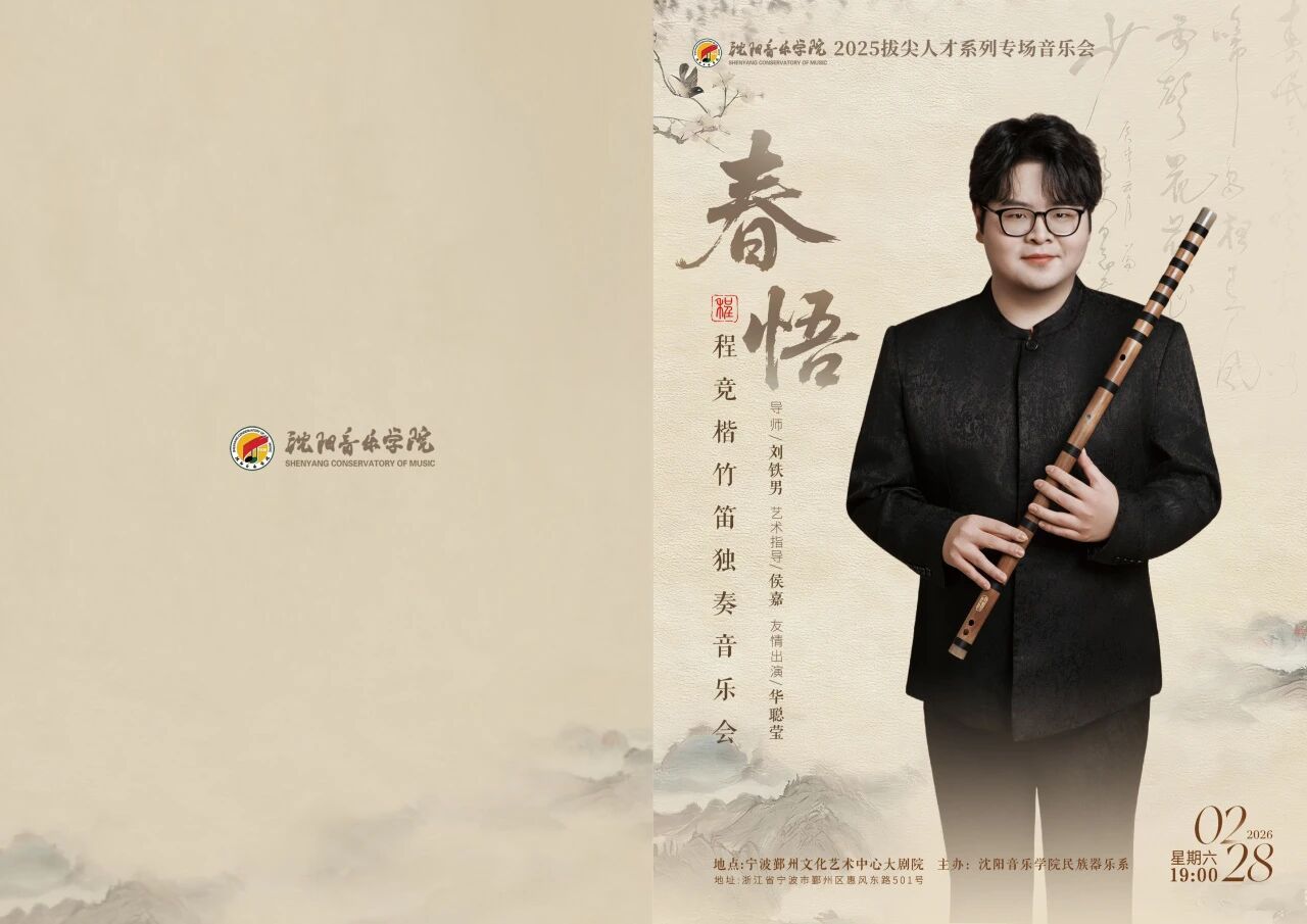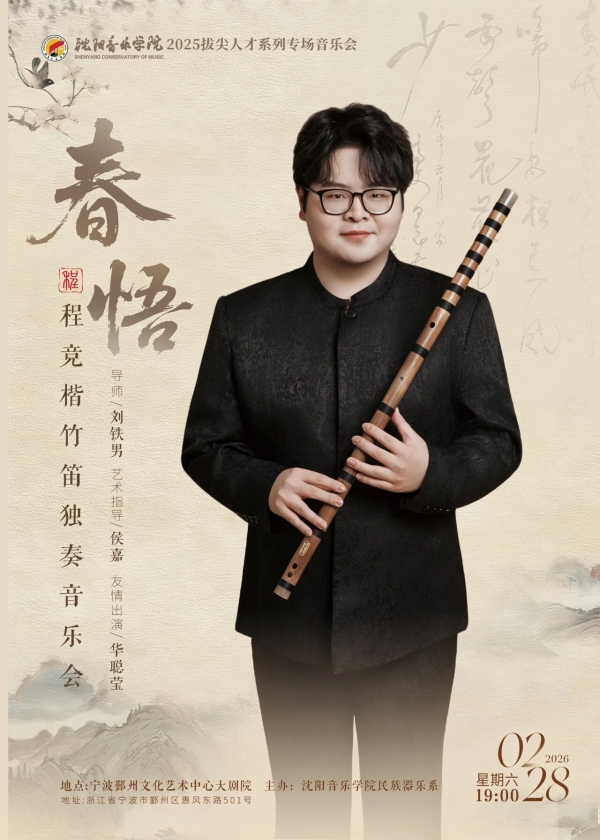程竞楷,浙江宁波人,2005年出生。12岁开始学习竹笛,师从竹笛演奏家吕钦老师。2023年考入沈阳音乐学院民族器乐系,师从著名竹笛演奏家、教育家刘铁男教授。入学前夕,曾得到著名竹笛演奏家、教育家詹永明教授的悉心指教。在校期间,曾荣获2024-2025学年三等奖学金,2024-2025学年“艺术实践先进个人”,沈阳音乐学院2025-2026年度拔尖人才等荣誉称号。本人在学习竹笛过程中,曾多次参加国内外竹笛大赛并取得优异成绩,曾获第三届松庭杯少年组金奖,第四届江苏省青少年竹笛大赛特别奖,2024第五届新加坡南洋音乐大赛银奖,2025乐通天下竹笛艺术展演金奖,2025第六届松庭杯金奖等。