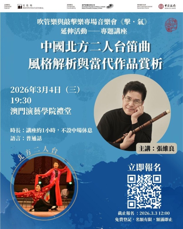 3月4日(星期三)晚上7時30分,澳門中樂團將於 #澳門演藝學院禮堂 舉辦《擊·氣》延伸活動 - 專題講座《中國北方二人台笛曲風格解析與當代作品賞析》。講座特邀“中國笛王”張維良作爲主講,意在帶領觀衆進行一場深度探索北方非遺瑰寶的旅行。