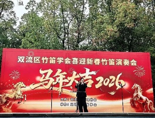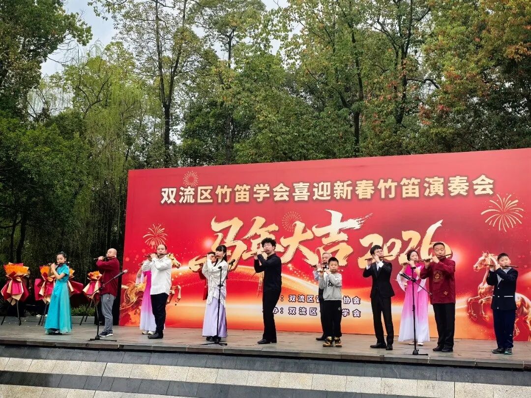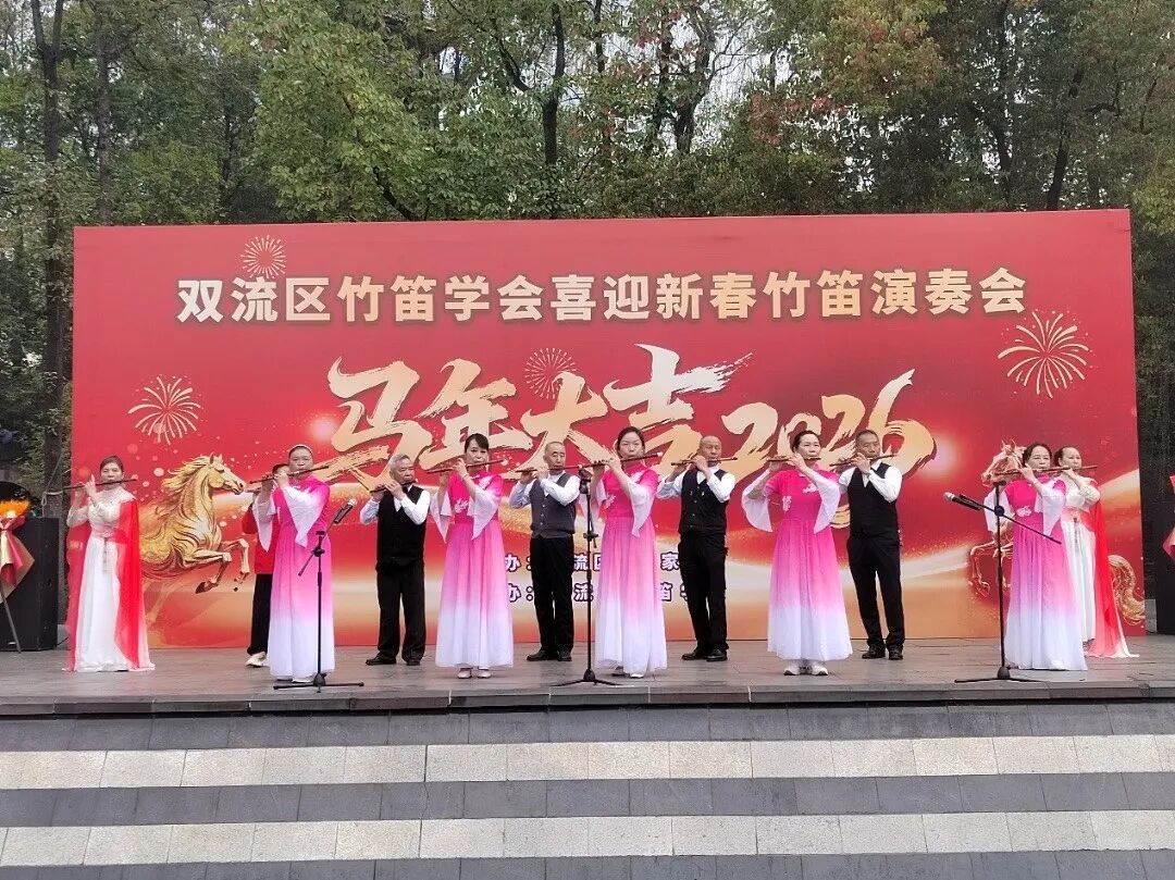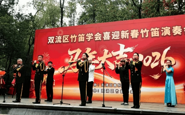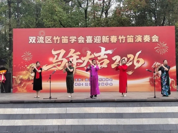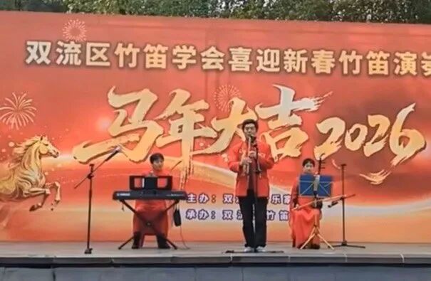 2026年2月27日下午,成都市双流区竹笛学会在棠湖公园演艺广场成功举办2026“喜迎新春”竹笛演奏会。整场演出以笛为媒、以乐传情,为市民献上一场精彩的民族音乐盛宴,送上新春的美好祝福。